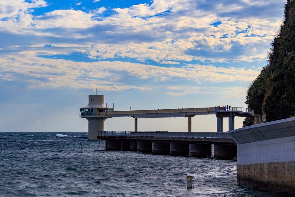 ・勝浦海中公園展望塔は海の上に建てられた細い橋を渡りらせん階段を降りダイバー気分で海中観察を楽しめます