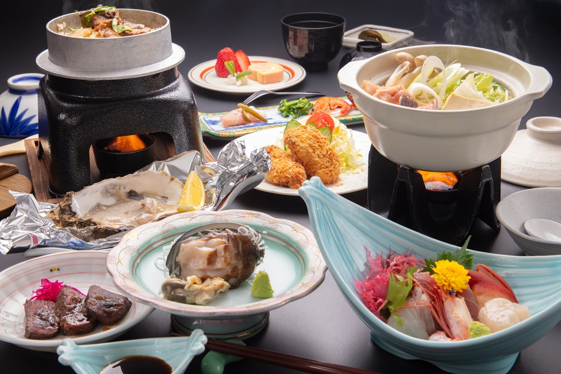 ・金華山沖でとれた新鮮な海の幸料理で人気の宿ではオーシャンビューのお部屋をご用意します。