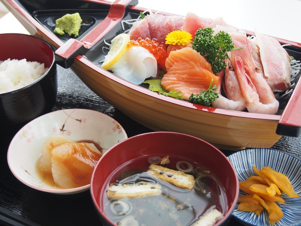 ・昼食は生メバチマグロの舟盛り定食(イカ・タコ・サーモン・赤海老・マグロなど)をご賞味