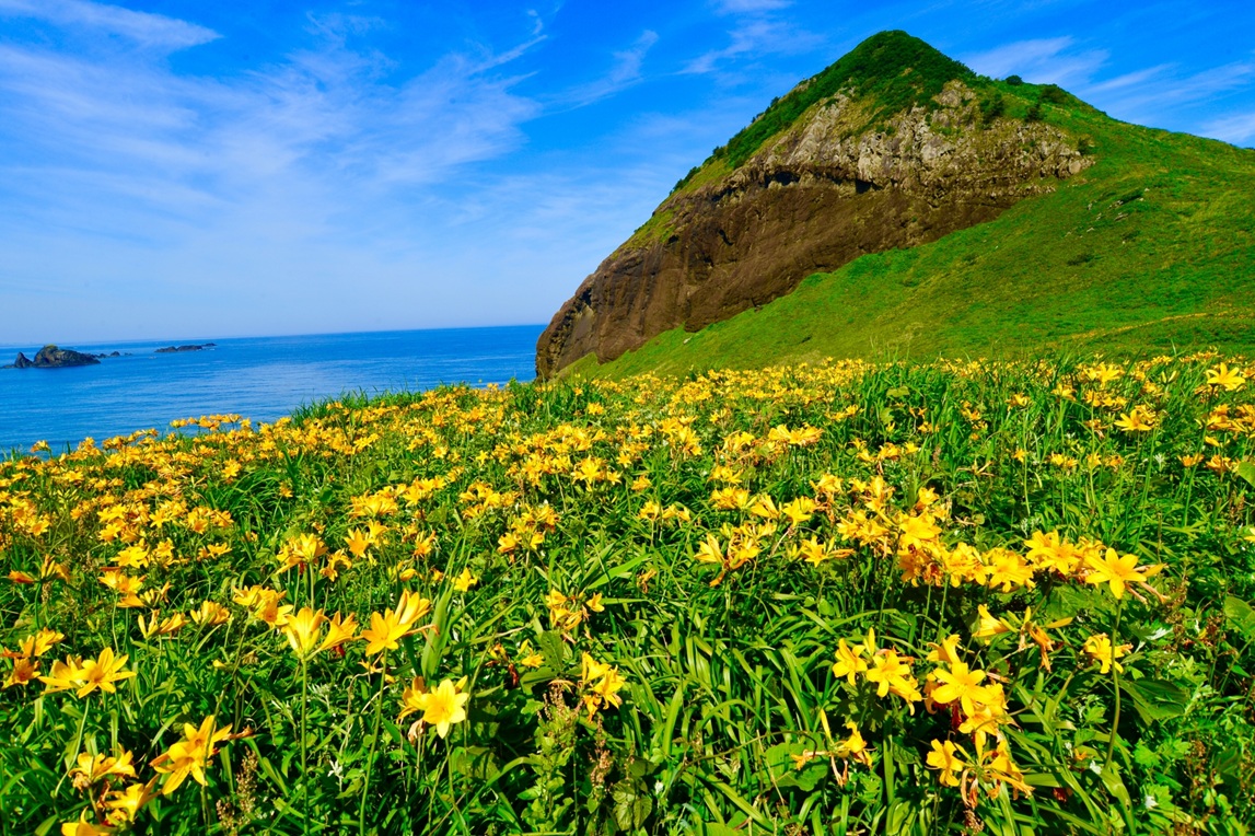 佐渡の秘境、外海府海岸のシンボル大野亀と日本一100 万本のトビシマカンゾウ大群生 花の島佐渡